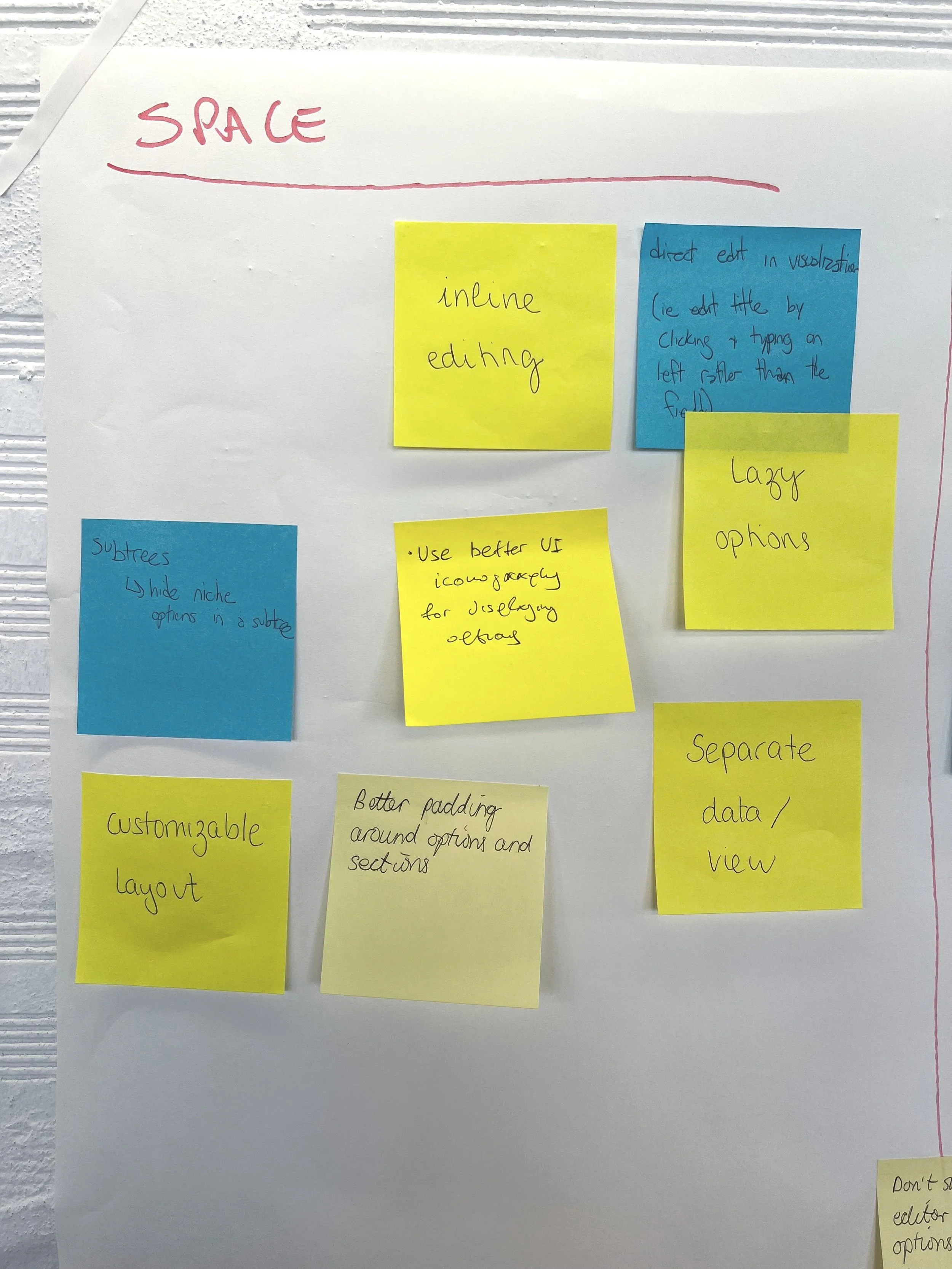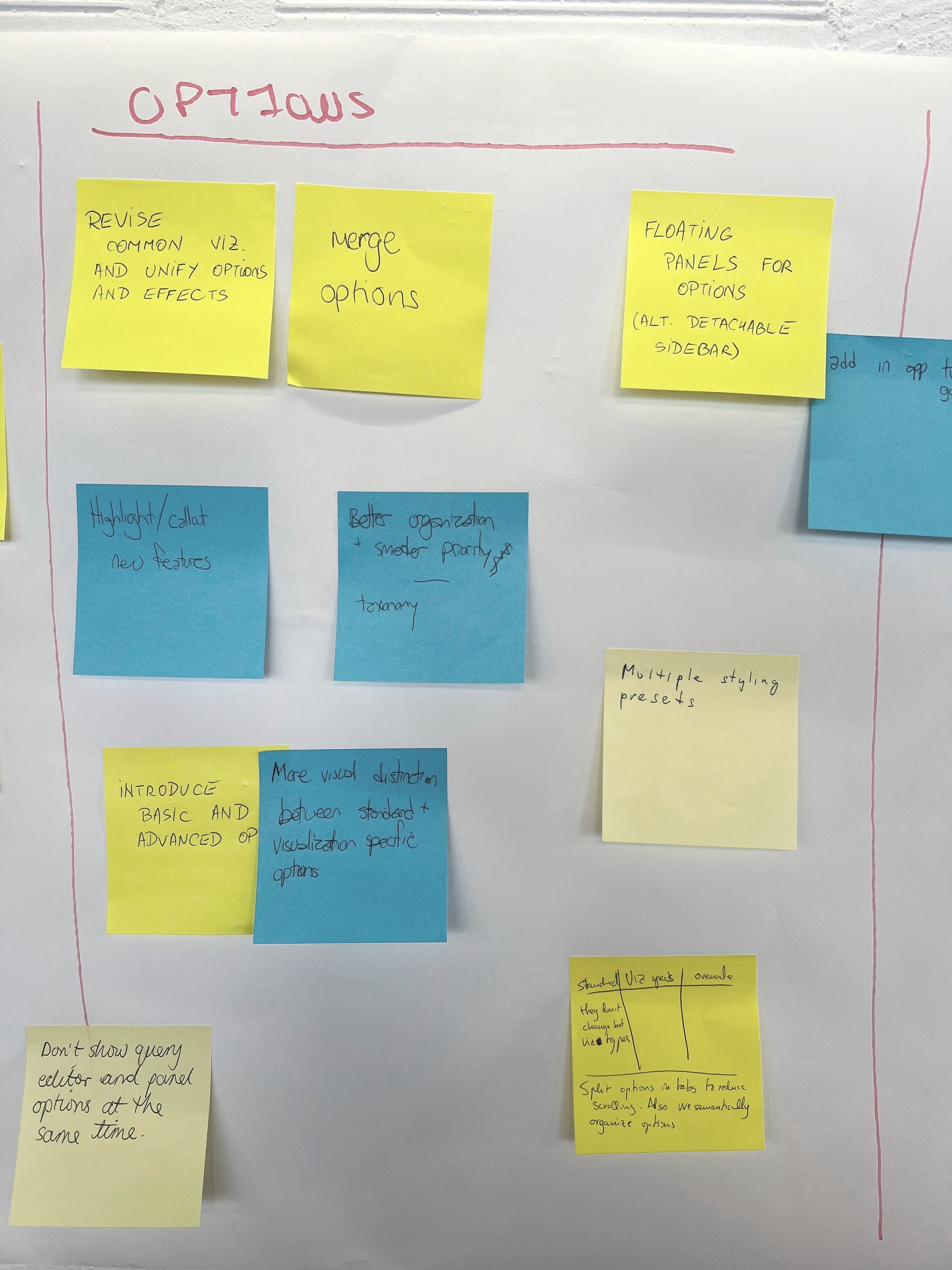 The panel edit experience at Grafana has major ownership overlap of many different development squads, all owning different parts and functionality. In order to bring alignment with all of them, it was decided to run a workshop at a team offsite. This provided opportunity for all of us to air our frustrations with the currrent UI and IA of the experience.